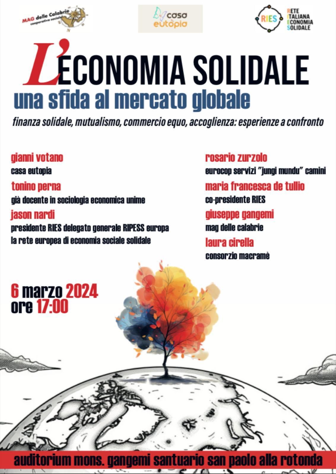 Relatori: Gianni Votano (Casa Eutopia), Jason Nardi (co-presidente RIES), Tonino Perna, Rosario Zurzolo (Eurocoop Jungi Mundi – Camini), Maria Francesca De Tullio (co-presidente RIES), Giuseppe Gangemi (Mag delle Calabrie), Laura Cirelli (Consorzio Macramé)