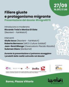Sabato 27 settembre, dalle 16 alle 17, a Multi – Piazza Vittorio, Roma, scopriremo come i produttori migranti stanno diventando protagonisti di filiere agroalimentari etiche, sostenibili e inclusive.