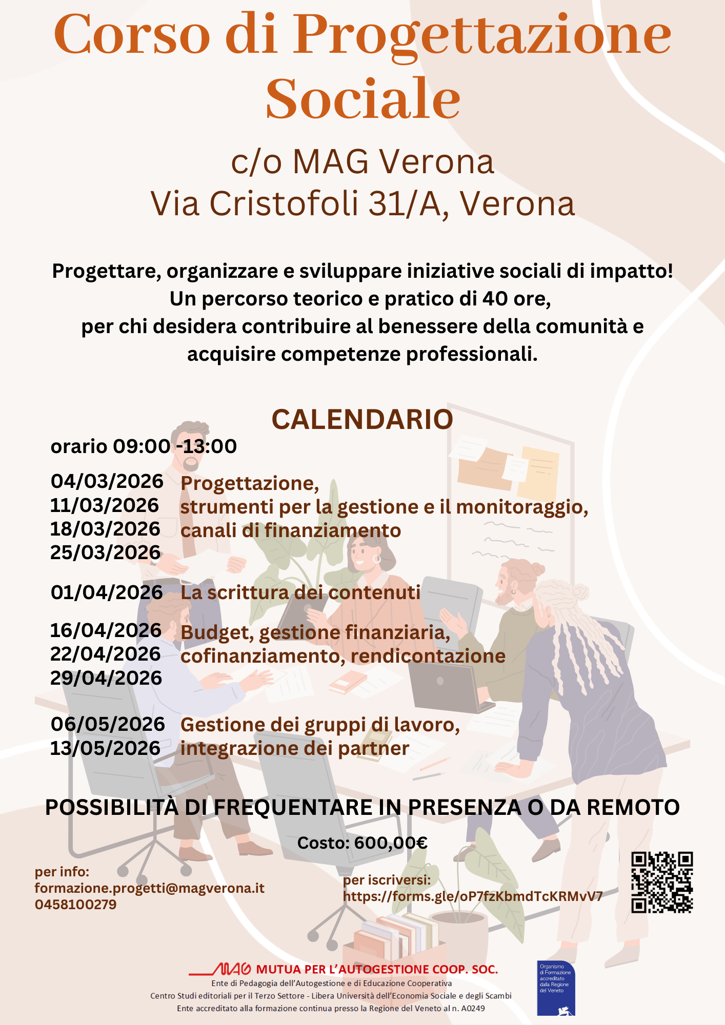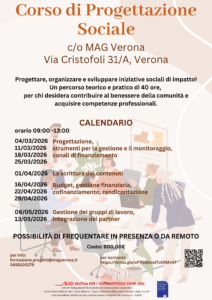 La MAG – Mutua per l’AutoGestione cooperativa sociale di Verona organizza un Corso di Progettazione Sociale che si terrà dal 4 marzo al 13 maggio 2026.